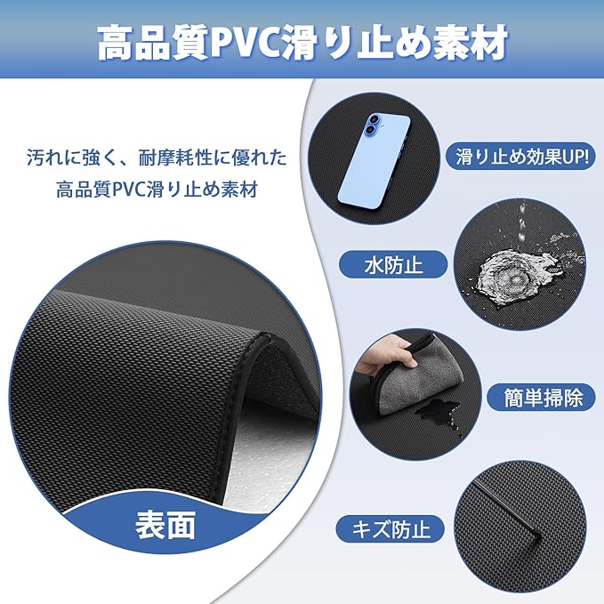 3.【高品質PVC滑り止め素材】:従来の製品と違って、本製品は新改良PVC滑り止め素材を採用され、モノ滑りにくく、運転中の荷物が保護でき、柔軟性があり、軽くて持ち込みやすいです。また、製品表面が特殊エンボス構造により繊細で立体的な凹凸が現れ、耐久性も優れています。耐汚れ、耐摩擦に大変優れており、適度な柔軟性を持っています。