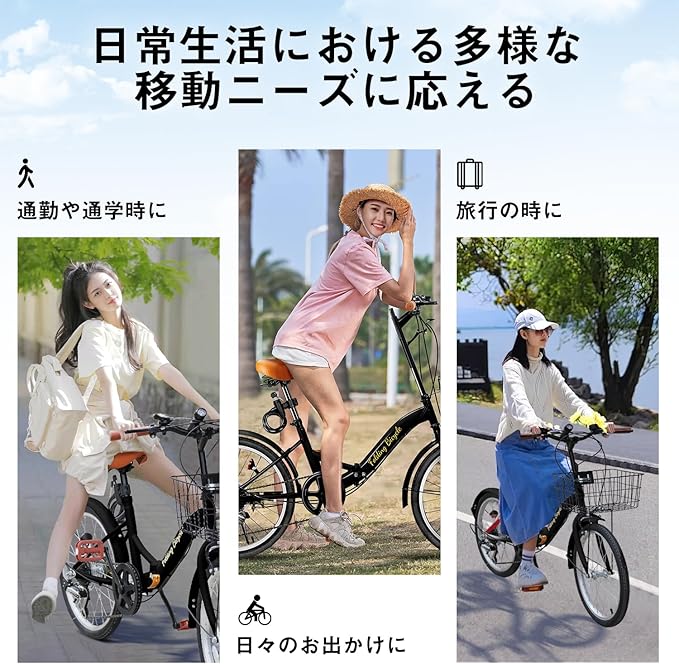 【折りたたみ自転車】: 本体サイズ(cm):約全長148x高さ98x幅56。 折りたたみサイズ(cm):約全長78x高さ75x幅32 。サドル地上高(cm):約66-84cm 。ハンドル地上高:約91-98cm 。重量:約11.5kg。適応身長:145cm以上 。耐荷重:約75kg 。自転車の必需品【カゴ、ワイヤーロック、ライト、空気入れ、ベル】が付属!日常使用に必要なものを取り揃え、あらゆるライディングニーズに応えられます。