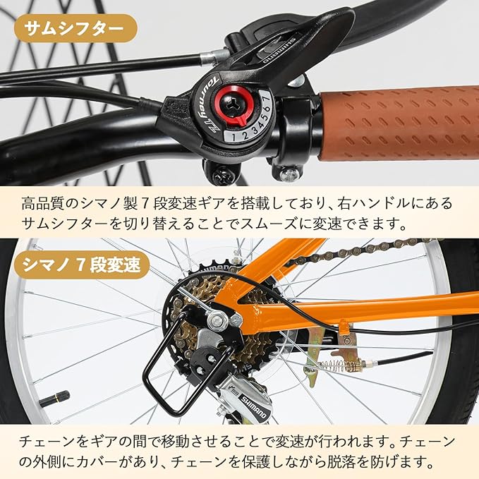 【シマノ変速機・7段変速ギア】この折りたたみ自転車は日本で知名度の高いシマノ製の変速機を搭載し、変速がよりスムーズで安定しており、安全性も高いです。自転車には7段階の変速ギアを備えており、路面状況に合わせて最適なギアをお選びいただけます。平地から緩やかな坂道まで、あらゆるライディングシーンに対応し、快適に走行することができます。