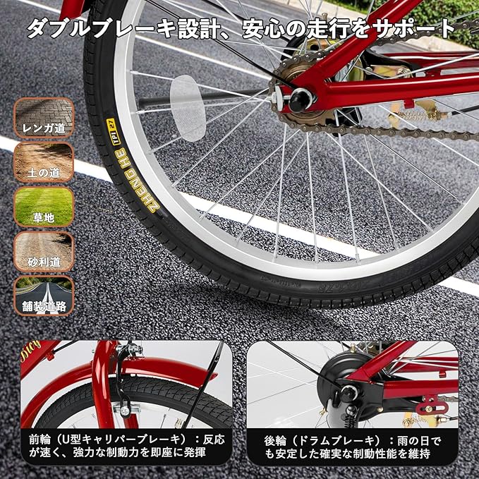 【優れた制動力】折り畳み自転車の前輪にはU型キャリパーブレーキ、後輪にはドラムブレーキを採用しており、素早い反応を実現します。強力なブレーキと耐摩耗性・滑り止め性に優れたタイヤが相まって、優れた制動力で走行中の安全を守ります。