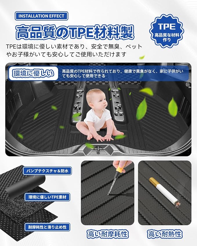 【高品質の環境保護素材】ヴェルファイア カーゴマット/アルファード カーゴマット は高品質のTPE素材を使用、耐衝撃性、耐磨耗性に優れ、表面劣化などが起こりにくく、長時間ご愛用いただけます。さらに、清掃簡単、水洗OK、折畳OK、繰り返して使えます。防水、防雑音、長寿命、無臭無毒、高低温に耐えられます。温度の高い夏場や寒い冬場でもご使用いただけます。