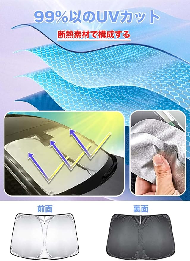【高品質のマテリアル】:サンシェード 高品質素材、4層構造、アルミメッキ、厚手ポリプロピレン不織布採用、耐熱性、強度に優れ、耐磨耗性が高く。この製品のメリット:① 前面はアルミメッキの高品質遮光板で、遮光性が高い。② ミラーが干渉しなく、内装劣化防止。③ 軽量でラインデザイン、コンパクトに折りたたんで収納できる。④ 裏側はポリウレタンブラック断熱シートになります、紫外線の照射を遮断する。