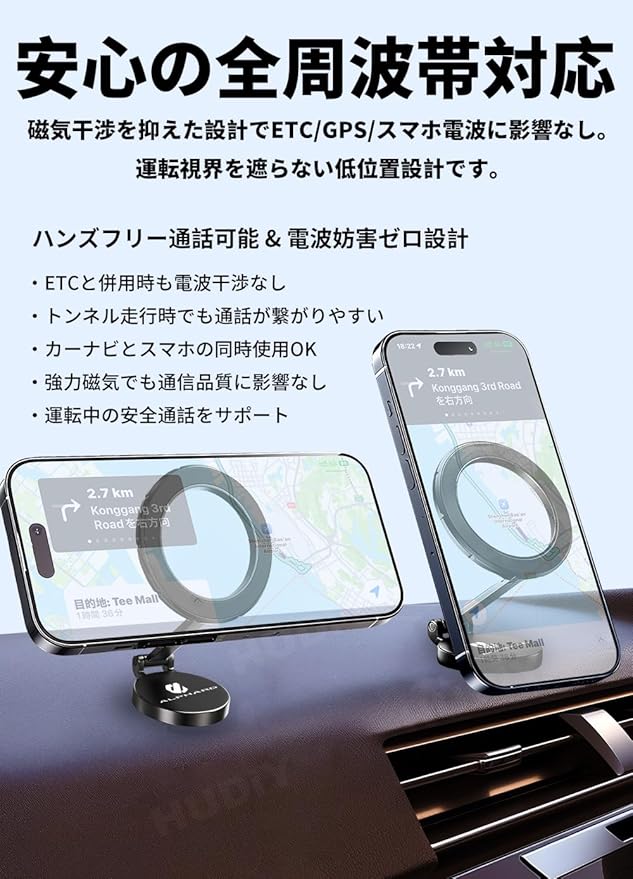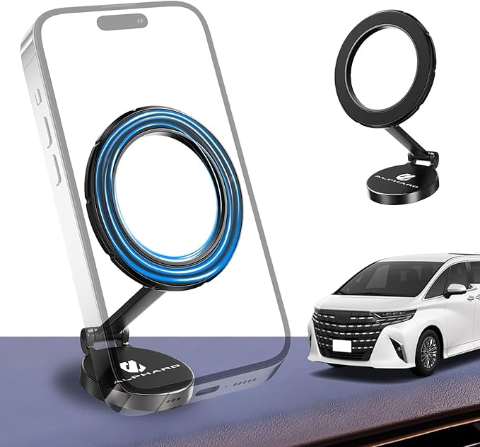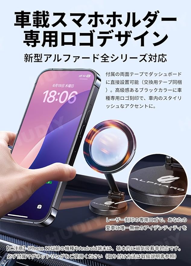 HUDIY(フーディ)車載スマホホルダー 新型アルファード40系/30系全シリーズ対応 マグネット式 携帯ホルダー 専用ロゴデザイン アルミニウム合金 360度回転 車載携帯ホルダー 安定性拔群 折りたたみ式 片手操作 落下防止 取付簡単 アルファードカーアクセサリー 日本語説明書付き(ブラック)