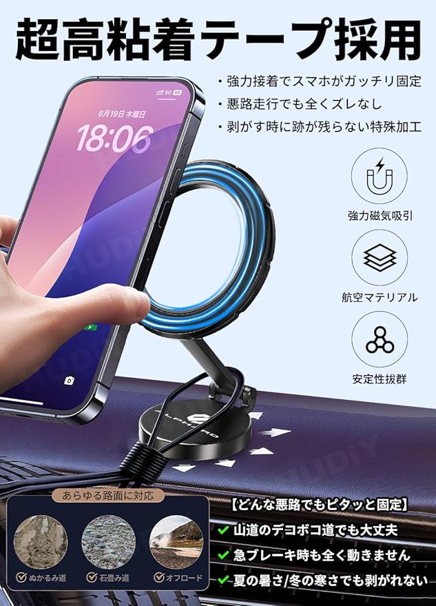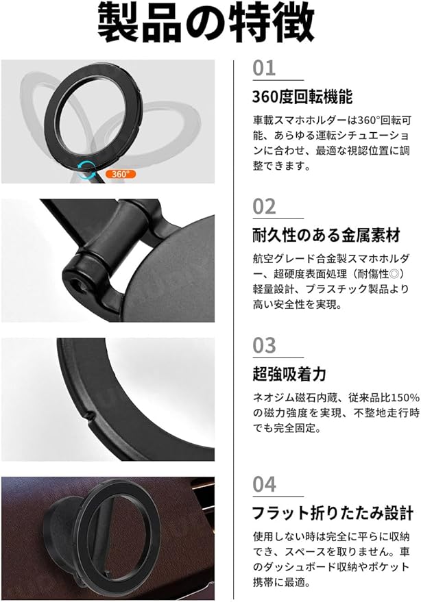 [360 自由回転|強力磁気吸引固定] 超強力内蔵マグネット+マグネットリング2個付属。スマホをガッチリ固定、砂利道やぬかるみ道などの悪路でも全くズレません。片手でサッと操作でき、運転中のナビ設定もらくらく。360 全方向回転可能で、縦向き・横向きはもちろん、微調整も自由自在。カーナビ視聴は縦位置、動画鑑賞は横向きと、シーンに合わせて最適なアングルに即調整可能!※ご注意:スマホ本体に磁気機能がない場合(iPhone12以前/Android機種など)は、付属のマグネットリングを取り付けるか、磁気対応ケースをご使用ください(取り付け方法は同梱の取扱説明書でご確認いただけます)。