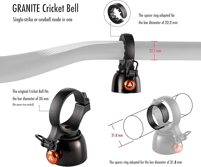 Granite(グラナイト) クリケット(Cricket)マウンテン自転車ベル - シングルストライクモードと連続カウベルモード付き、22.2mmから35mmハンドルバー用バイクベル
