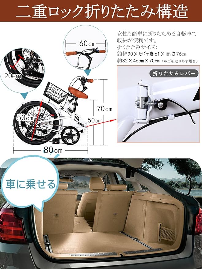 【仕様】 折りたたみサイズ:カゴ付き/約W90 D61 H76cm、カゴなし/約W82 D70 H46cm 本体重量:約14kg サドル高さ:約72~81cm ハンドル高さ:約94.5~96cm ※ 手作業による計測のため、若干の誤差が生じる場合があります。ご了承ください。