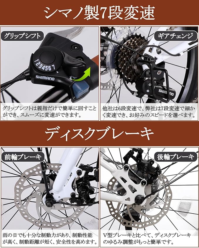 【前後ディスクブレーキで、どんな道でも安心】 一般的な自転車はVブレーキやバンドブレーキを採用していますが、雨の日や長い下り坂では不安が残ります。私たちが選んだのは前後ディスクブレーキ。リニアな制動力で、ブレーキをかけた分だけしっかり効くので、雨の日も坂道も思い通りにコントロールできます。取り付けや調整も簡単で、少しでも速く、安心して走りたいあなたにぴったりです。