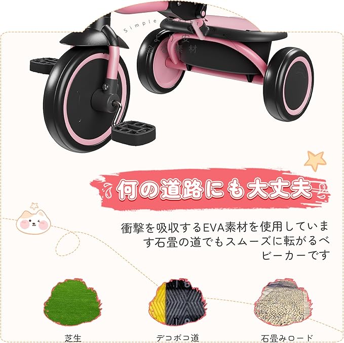 【どんな地形でも快適な乗り心地】衝撃吸収を優れた頑丈なEVAを作ったホイール、お子様が快適かつ自信を持って様々な地形を制覇できるようサポートします。