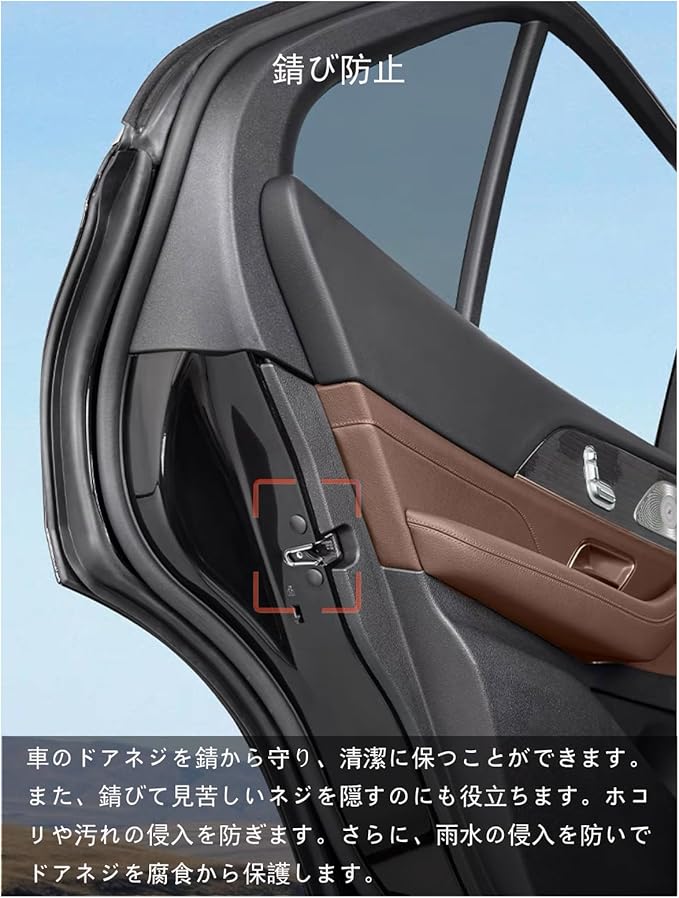 錆び防止:車のドアネジを錆から守り、清潔に保つことができます。また、錆びて見苦しいネジを隠すのにも役立ちます。 ホコリや汚れの侵入を防ぎます。さらに、雨水の侵入を防いでドアネジを腐食から保護します。