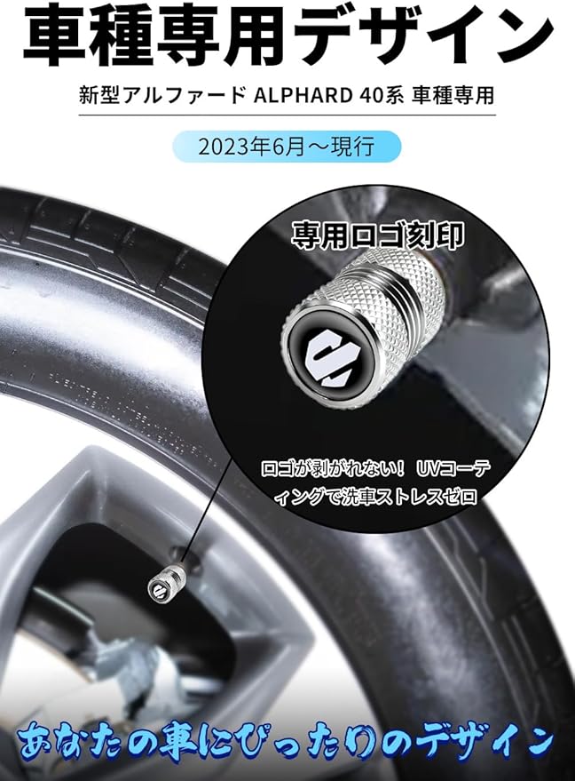 【 高級感アップ】適合アルファード 40系AAHH40W AAHH45W (2023年6月~現行)。アルファード専用にデザインされたアルミ合金製バルブキャップ。専用ロゴを精密彫刻で施し、ワンランク上の質感とおしゃれな雰囲気を実現。愛車のホイールを引き立て、個性をアピールするカスタムパーツです。