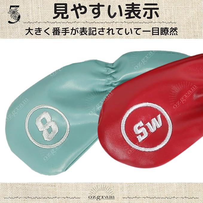 【一目で分かる刺繍ナンバー】 各カバーには大きく刺繍で番手が表記されており、プレー中のクラブ選びがスムーズ。 見やすく使いやすい設計です。