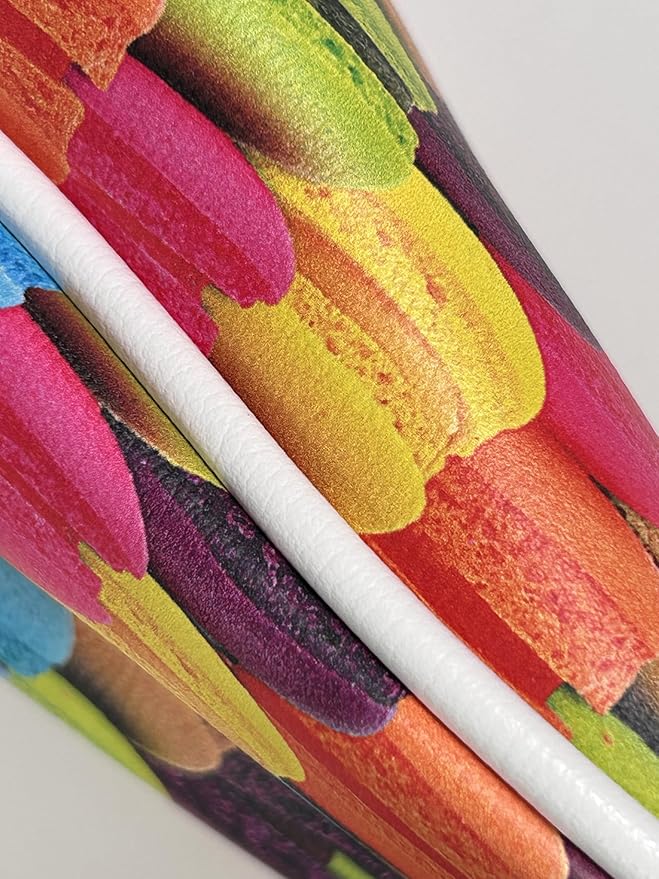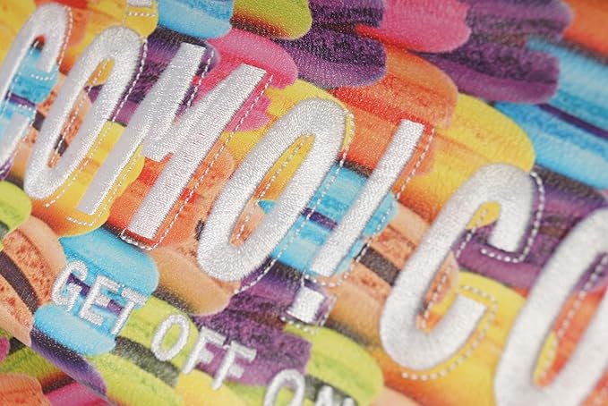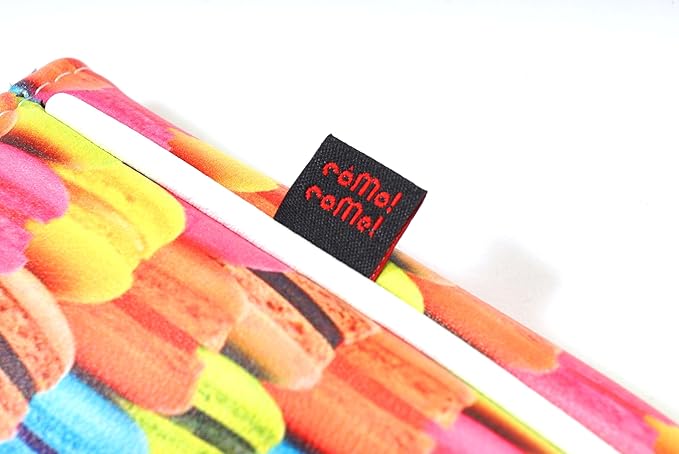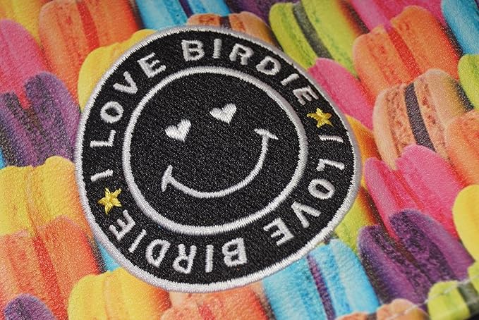 マカロンのカラフルなプリントに刺繍のロゴ。ニコちゃんモチーフのワッペン風刺繍と可愛さ満載のデザインです。