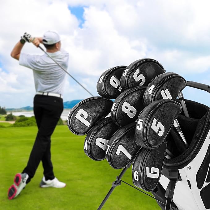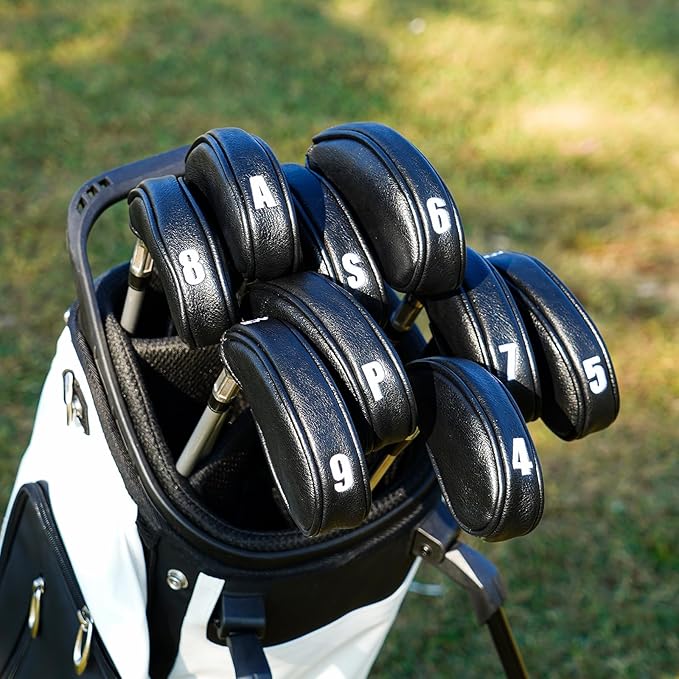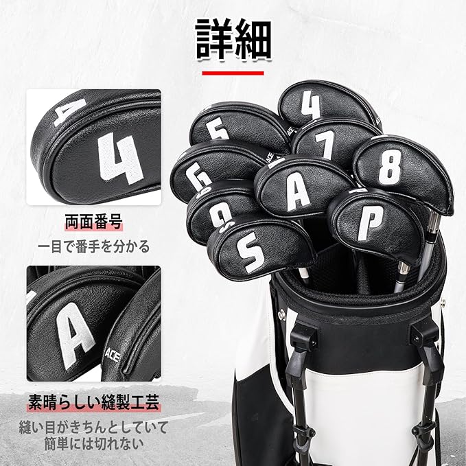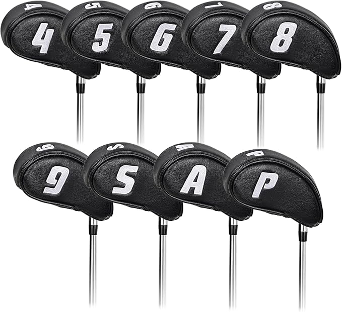 ゴルフアイアンカバー 伸縮性ある開閉 ウェッジカバー クラブヘッドカバー セット 9pcs(4-9,P,A,S) 正面と側面白い番号 黒い合成皮革 三片式