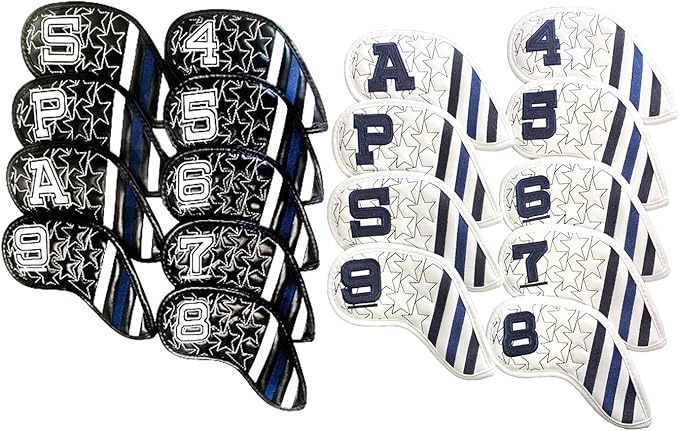 ゴルフヘッドカバー アイアンカバー アイアン用 刺繍入り 9点セット 4-9番 P、A、S番 番手付 星 ライン 黒 白 特徴:撥水、傷防止効果よく、着装やすい 表示番手:4番 5番 6番 7番 8番 9番 P番 A番 S番 商品内容:9点セット 材質:高級pu革(表地)アクリル繊維(裏地)