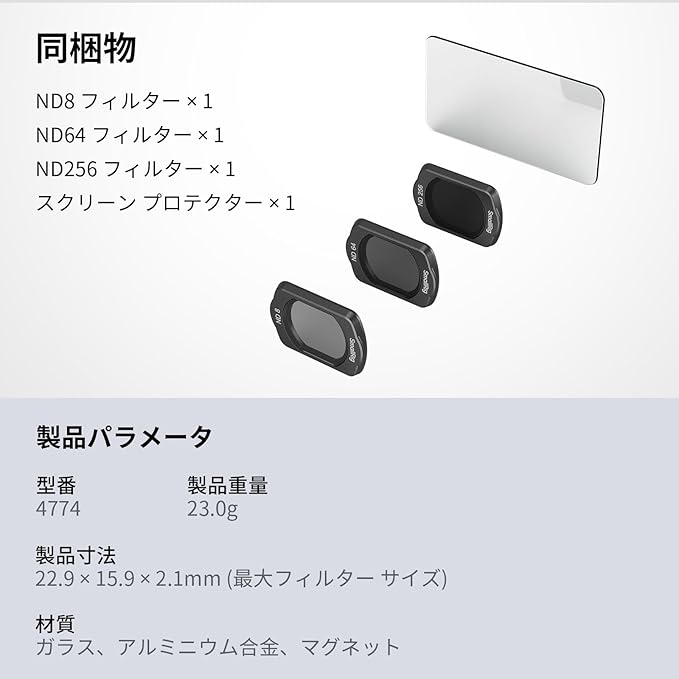 【ご注意】ND8、ND64、ND256フィルター、スクリーンプロテクターが付属します。