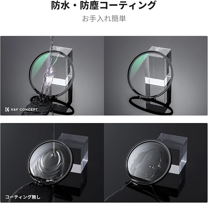 【撥水防汚加工&カビ止め】撥水(WPC)加工、軽く拭くだけで簡単に水滴が消え去ってくれます。指紋がつきにくく、汚れても簡単に拭き取れます。貴重なレンズをしっかり守る保護フィルターです。