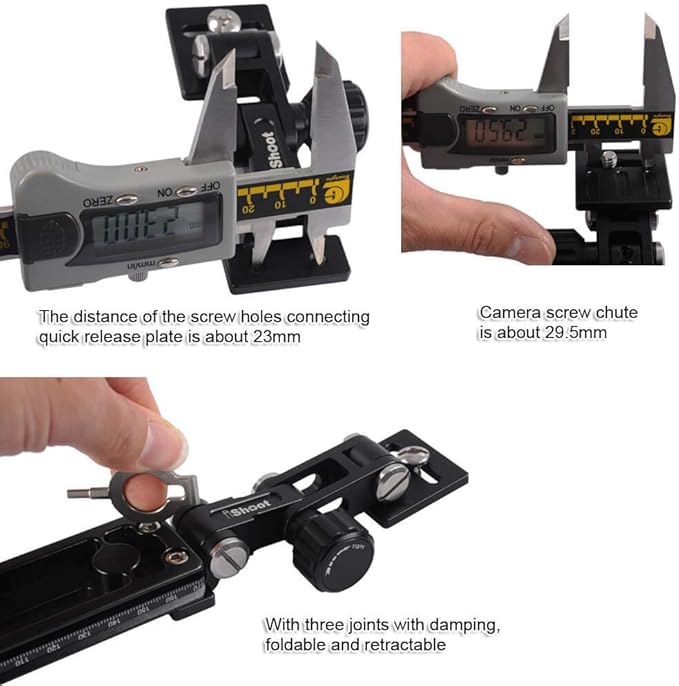 2.クイックリリースプレートを接続するネジ穴の距離は約23mmです。 ダンピング付き、折りたたみ式、格納式の3つのジョイント付き。 カメラのスクリューシュートは約29.5mmです。