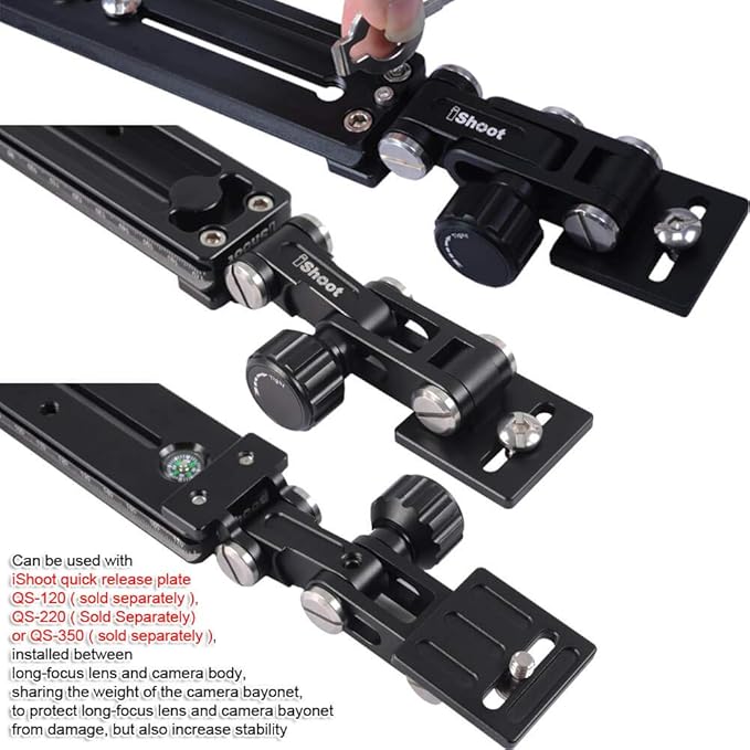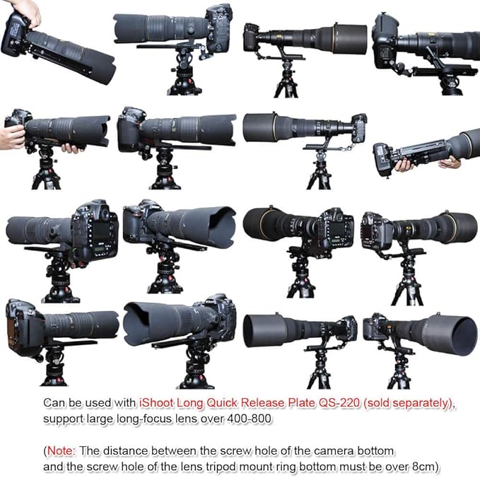 3.ロングフォーカスレンズとカメラ本体の間に取り付け、カメラマウントの重量を分担してロングフォーカスを保護するiShootクイックリリースプレートQS-120、QS-220、またはQS-350(別売)と併用できます レンズとカメラは損傷からマウントされますが、安定性も向上します。
