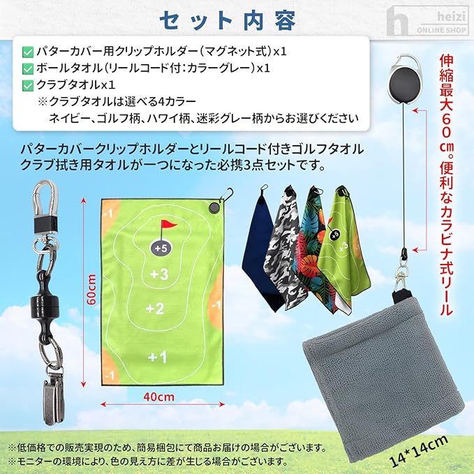 ✅【商品内容】[セット内容] ボールタオル(リールコード付)x1,パターカバー用クリップホルダー(マグネット式)x1 , クラブタオルx1 [カラー(クラブタオル)] ネイビー、グリーン(ゴルフ柄)、ハワイ、迷彩(グレー)