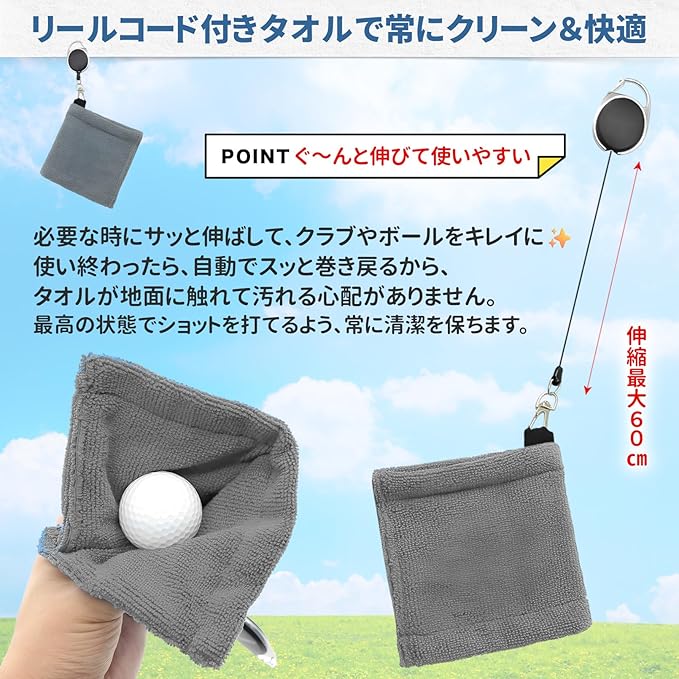 ✅【便利なリール付きボールタオル】ボールタオルはリールコード付き。ベルトやバッグに取り付けておけば、ボールを拭いたあといちいちポケットに仕舞う手間が解消。スムーズで快適なプレーをご体感ください。