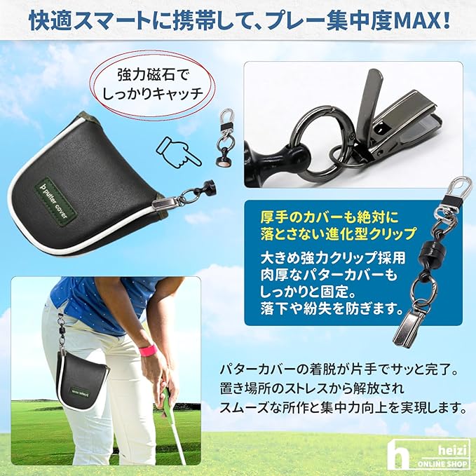 ✅【厚手カバーも絶対に落とさない進化型クリップ】大きめの強力クリップ採用により肉厚なパターカバーもしっかりと固定し、大切なカバーの落下や紛失の不安からゴルファーを完全に解放します。