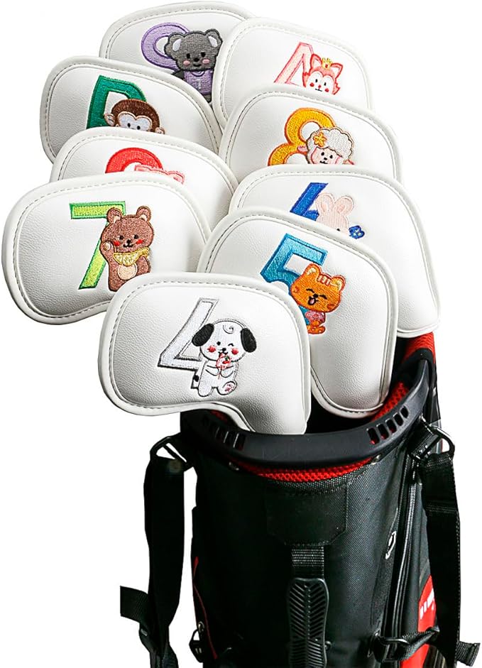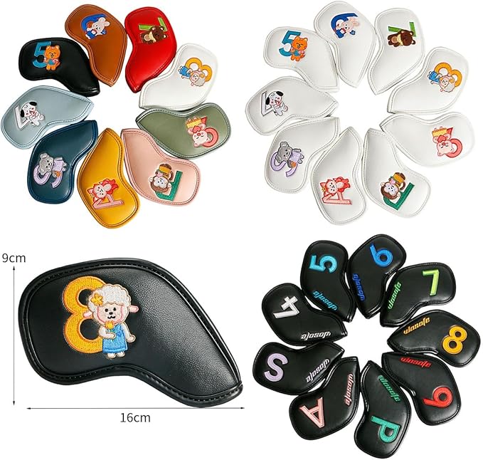 ゴルフアイアンカバー 軽量 マジックテープ開閉 防水 高級PUレザー 可愛い 両面番号刺繍 ウェッジカバー