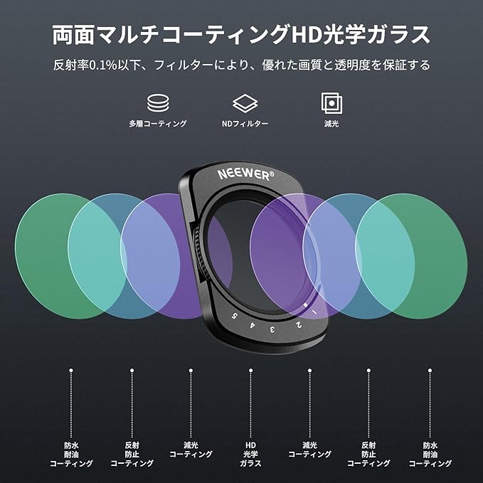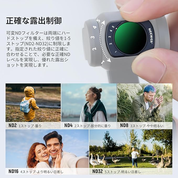 NEEWER 可変NDフィルター コンパチブル Osmo Pocket 3 Creator Combo アクセサリー マグネット式 ND2-32フィルター 磁気1-5ストップ調整可能 NDフィルター 減光アクションカメラレンズフィルター/2枚スクリーンプロテクター/2枚クリーニングクロス付き