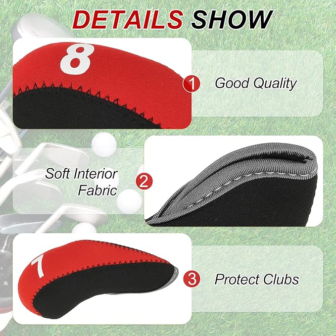 カラー:レッド; 素材:ネオプレン; 全体サイズ:140 75mm / 5.51 2.95インチ (長さ 幅); 穴の長さ:75mm / 2.95インチ(長さ); パッキングリスト:ゴルフクラブヘッドカバー10個