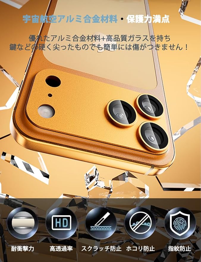 【4代目進化版・合金サンドブラスト加工】:カメラカバーはスマホのカメラ部分の全体を覆われている一体型のデザインです。カメラカバーの表面はサンドブラスト加工されて、サラサラな手触り。衝撃に強いアルミ合金加工と9H高透過率強化ガラスを組み合わせて最高な保護力を提供しています。