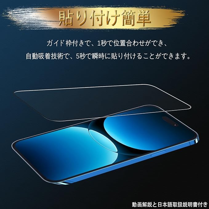 【インストールが簡単で、初心者適用 】弊社のphone15 pro ガラスフィルムは、自動吸着機能あり、誰でも完璧に貼り付けられる。ガラスをレンズスクリーンに軽く押すだけで自然に画面に吸着できます。特別な技術は一切不要で、初心者でも一度で成功できます。
