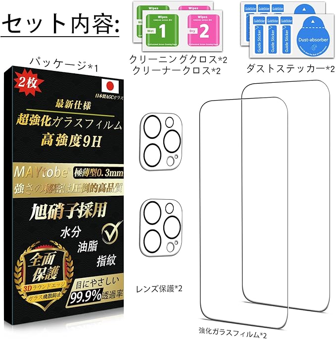 【ガラスフィルム 4枚セット】MAYtobe ガラスフィルム iPhone 15 Pro 用 ガラス保護 カメラレンズプロテクター 日本製旭硝子 【2枚液晶保護+2枚レンズ保護】 全面保護 硬度9H 耐久性 極薄 99%高透過率 保護フィルム 液晶 耐衝撃 気泡なし 指紋防止 飛散防止 撥水撥油 自動吸着 貼り付け簡単 3Dタッチ いphone15Pro 対応 保護フィルム ガラス