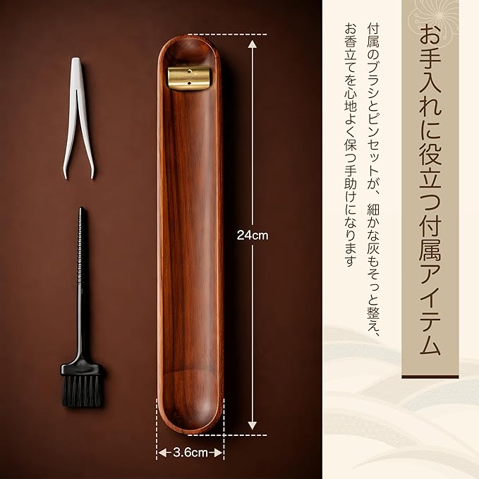 長さ約24cm、幅約3.6cm、高さ約1.5cmのスリムなサイズで、さまざまなお香に対応しやすく、限られたスペースにも無理なく置けます。また、日々のお手入れを助けるブラシとピンセットを付属し、細かな灰も整えやすく、心地よく使い続けられます。