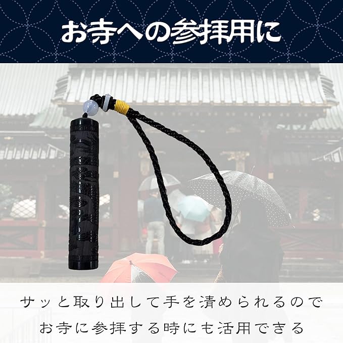 ストラップ付きで持ちやすい:この塗香入れにはストラップが付いています。手のひらに収まるサイズ感の塗香入れですので、持ち運びもしやすいです。カバンなどからの取り出しもしやすいです。