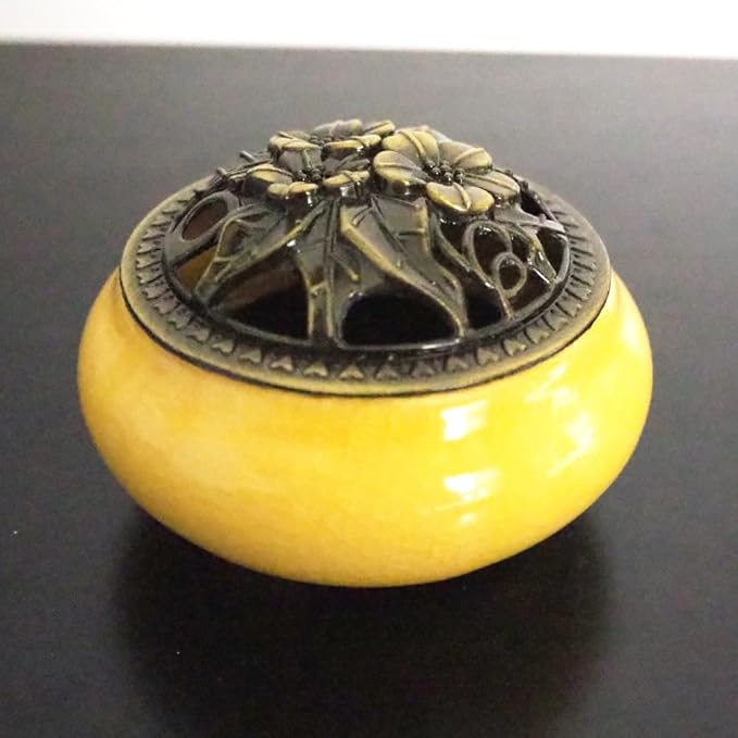 陶器製で、しっかりとした重さがあり、表面にはひび割れたような加工が施されています。 花のレリーフがあしらわれた蓋の隙間から立ち上る白煙は豪奢で、香りだけでなく、目でも楽しむことができるお香立てです。 鉢色はクリーム色に近い、明るく淡い黄色で、お部屋の雰囲気をより明るくしてくれます。