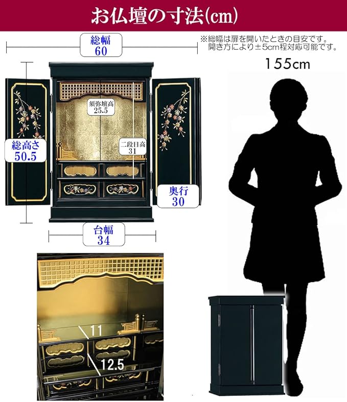 【お仏壇のサイズ】高50.5cmX幅34cmX奥30cm 扉開時幅 60cm(写真のように扉を開いたときの幅です。扉の開き方によって、55cm~設置可能です)