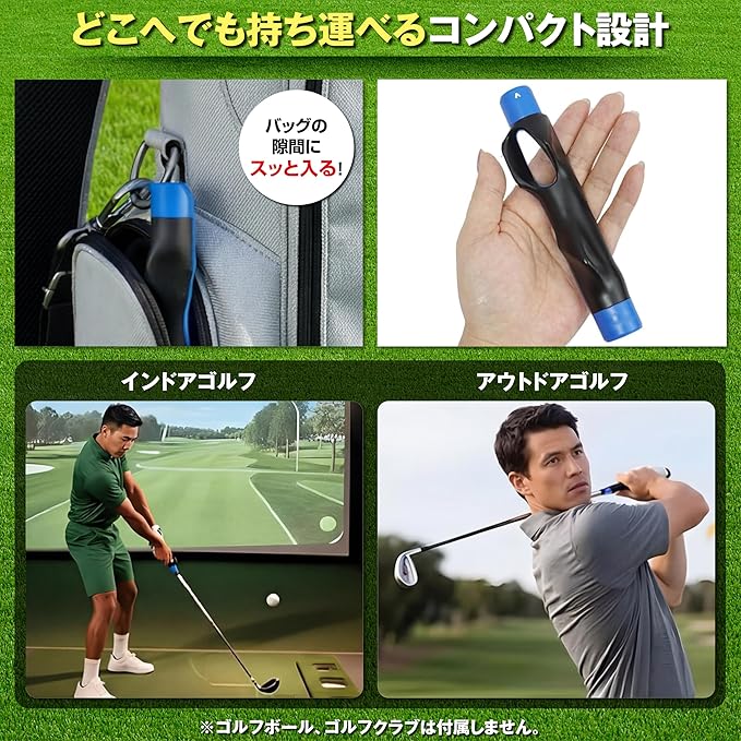 ✅【手持ちのクラブに「かぶせるだけ」の簡単装着】 お使いのゴルフクラブにサッと被せるだけで、使い慣れたクラブが練習用具に早変わり。三角の矢印を確認、向きに沿ってグリップにはめるだけ。コンパクトかつ軽量(約24g)なので、ゴルフバッグのポケットに入れて持ち運びやすく、練習場やラウンド前のウォーミングアップにも最適です。