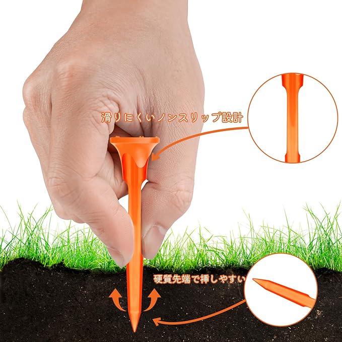 【挿入容易な機能性】:先端の鋭利な形状と滑りにくいミッドグリップ設計で、固い地面や湿ったコンディションでも簡単にティーアップ可能。