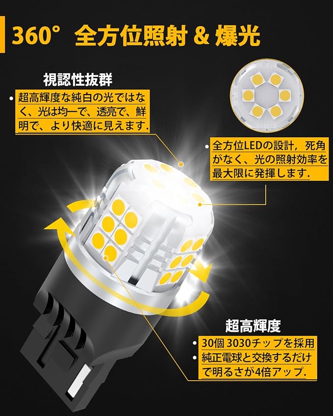 【超高輝度&長寿命】超高輝度1200LMの明るさ低電力消耗、最先端超高発光効率の3030LED素子30個搭載、360 全方位照射でき、12V車用T20 シングル バルブ。原装ランプより4倍に明るいです. 6000K-6500K純白の光です. 省エネ、しかないです. 長持ちで、運行時間は50000時間以上です. 起動時、遅延の状況がないです。