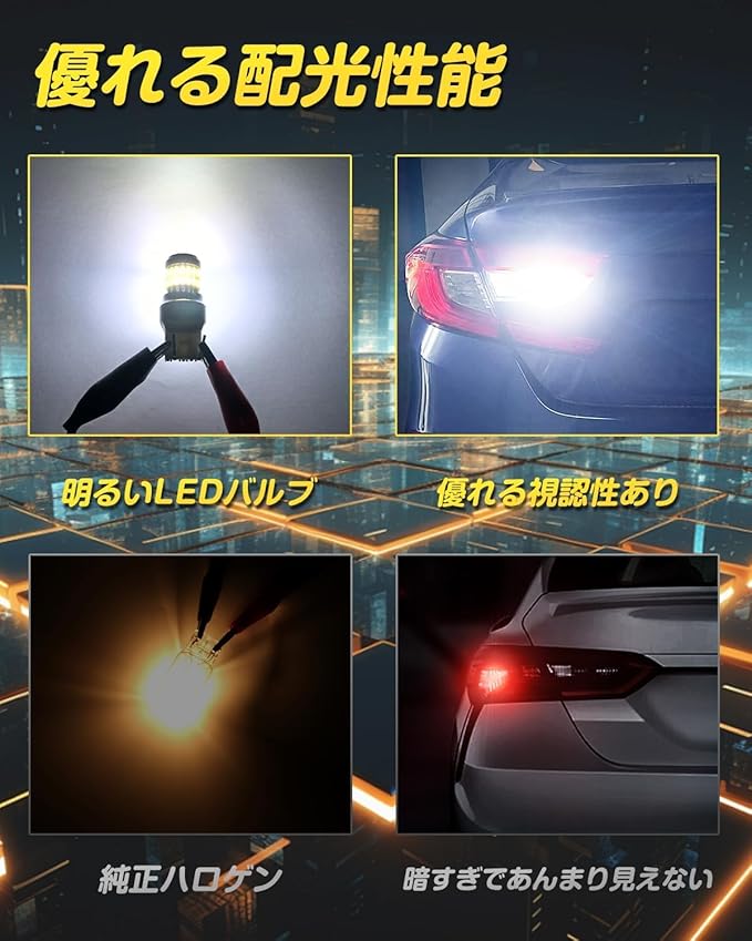 当社のT20ダブルLEDバルブは、テールランプとブレーキランプの輝度比を1:6に設計し、ブレーキ時の視認性を大幅に向上。最新型LEDチップを搭載し、従来のハロゲンバルブよりも高輝度かつ省エネで、長寿命を実現しました。