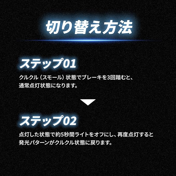 ✅【点灯切替を内蔵!お好みの発光パターンに変更可能!】従来のタイプでは、スモール点灯時は「クルクル」、ブレーキ時は「ストロボ」でしたが、新タイプでは点灯状態を自由に切り替えられる仕様に進化しました。シチュエーションやお好みに合わせて、最適な発光パターンを選ぶことができます。