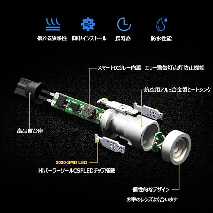最新高輝度CSP2020チップを3基搭載! 最新型CSP LEDを搭載したバルブ全光束2400LMの大光量を誇るバックランプ・ポジション専用球です。直視できないくらい明るさで視認性抜群です。合成強化ゴムで金口を強めに締めるので防水対策も万全でございます。