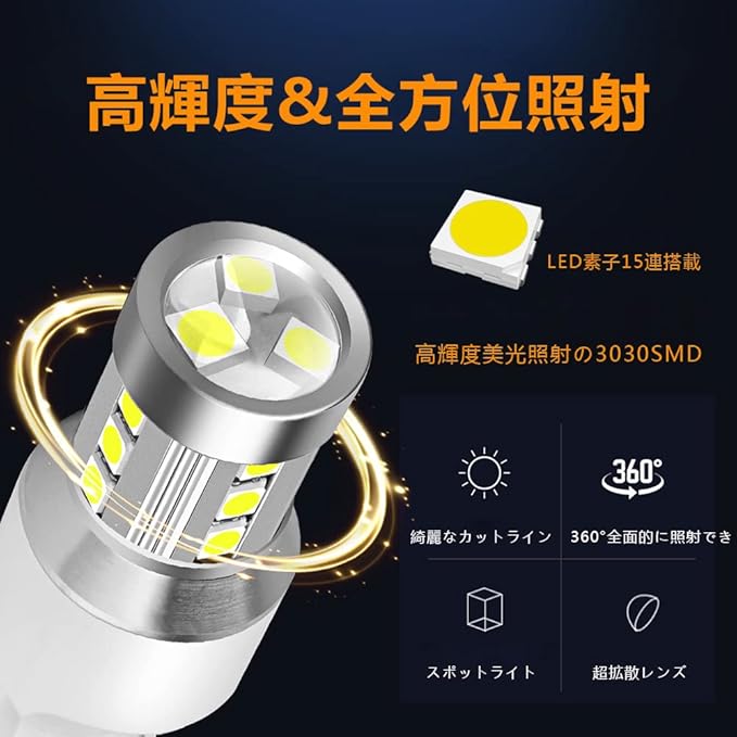 【2個T20 LED バックランプ】初の凹型デザインで、超拡散レンズ搭載で、光線を集中でき、照射距離UP、透光性と集光性は大幅アップになります。360 全方位照射できて、ムラのない美しい光を実現しています。2個T20 LED バックランプ最先端超高発光効率の3030LED素子15個搭載、動作電圧:DC12V、発光色:6000K 白。