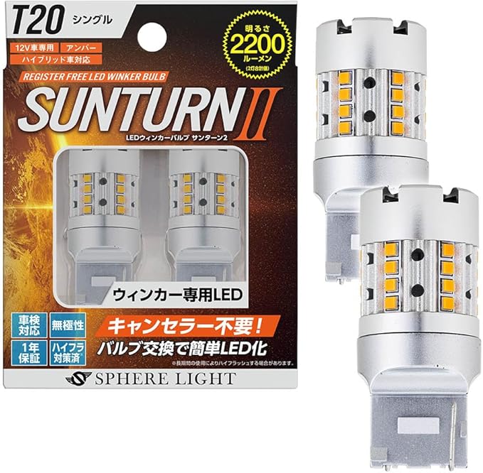 スフィアライト ウィンカー LED SUNTURN2 T20 シングル 2200lm アンバー 12V 車検対応 2個入 無極性 ハイフラ対策 ファン搭載 サンターン2 方向指示 バルブ SPHERELIGHT SUNT20S