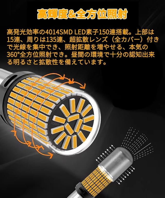 【高輝度&全方位照射】高発光効率の4014SMD LED素子150連搭載。上部は15連、周りは135連、超拡散レンズ(全カバー)付きで光線を集中でき、照射距離を増やせる、本気の360 全方位照射でき。昼間の環境で十分の認知出来る明るさと拡散性を備えています。市販のハロゲンより省エネルギーの上で、明るさは大幅にアップ!