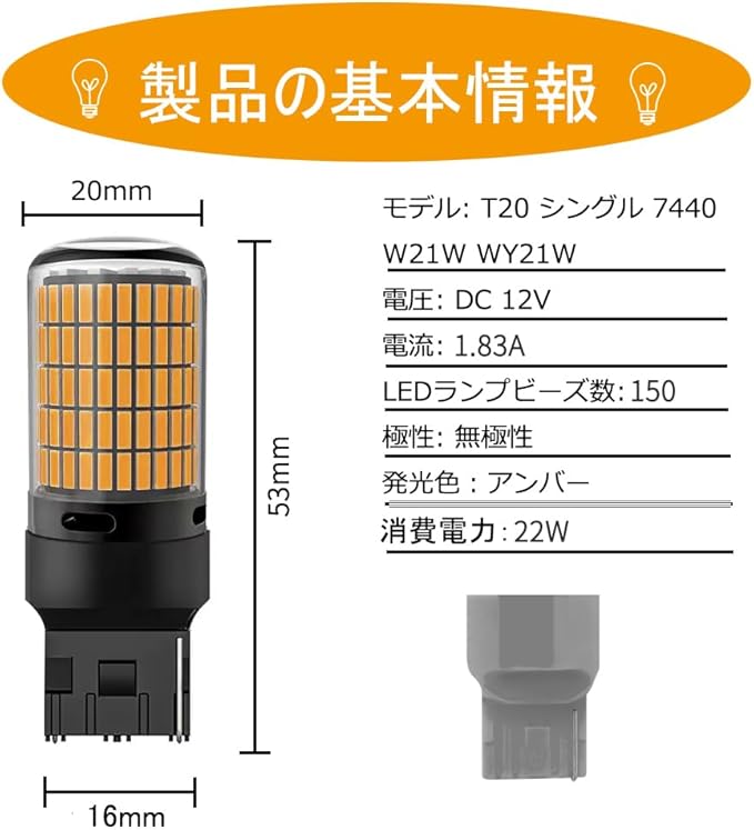 【商品 スペック】発光色:アンバー / LEDチップ:4014SMD / LEDチップ数:150連 / 入力電圧:DC 12V / 電流:1.83A / 消費電力:22W / 極性:無極性 / サイズ(約):全長53mm 最大直径20mm 差込口幅16mm / パッケージ内容:LEDバルブ 2。