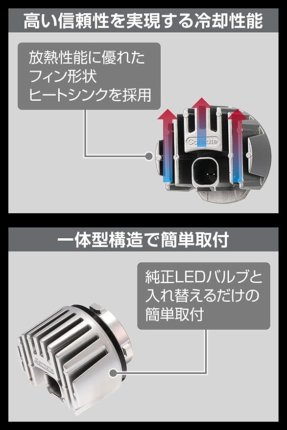 放熱性能を高めるにはヒートシンクを大型化する方法がありますが、バルブサイズが大きくなるため取り付けや適合などの問題が発生します。