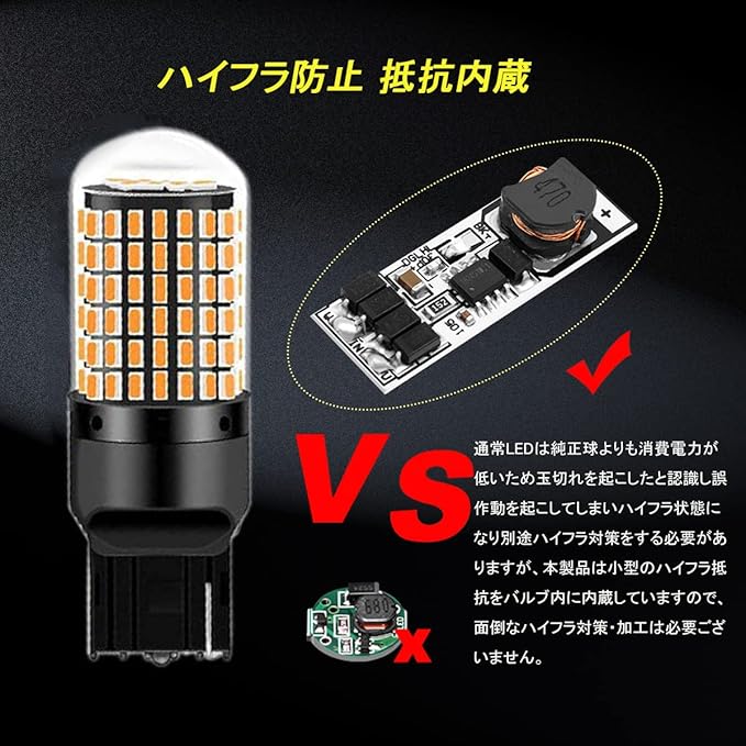 【ハイフラ防止機能内蔵】ハロゲンランプをLEDウインカーに交換する際に、通常車体側に抵抗を接続しないとウインカーが高速点滅するハイフラ現象が起きますが、本製品は小型のハイフラ抵抗をバルブ内に内蔵していますので無加工、ポンつけで取付ができます。