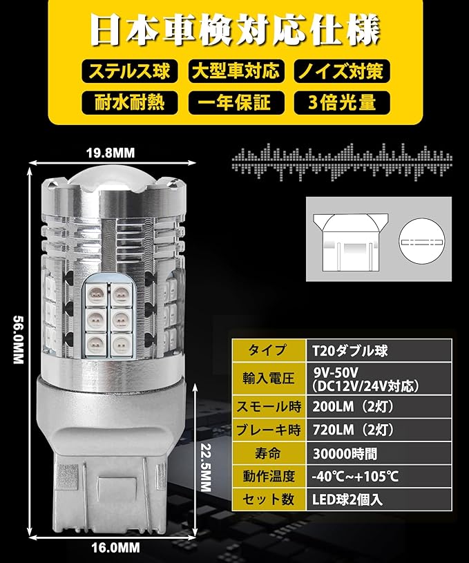 【製品情報】12V-24V車用T20ダブル球 7443LEDバルブ(2個セット)。発光色:レッド。対応電圧:9-50V(大型トラック/トレーラー使用可)消費電力:6W。チップ:36連ヘットライト級LEDチップ(側面30SMD+正面レンズ6SMD)。ラジオノイス対策:済。防水耐熱レベル:IP68。