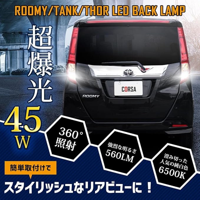 CORSA ルーミー タンク トール LED バックランプ T16 45W 560lm ウェッジシングル球 ホワイト 後退灯 高輝度 省電力 1120LM カスタム パーツ アクセサリー ドレスアップ ROOMY TANK THOR [2] M