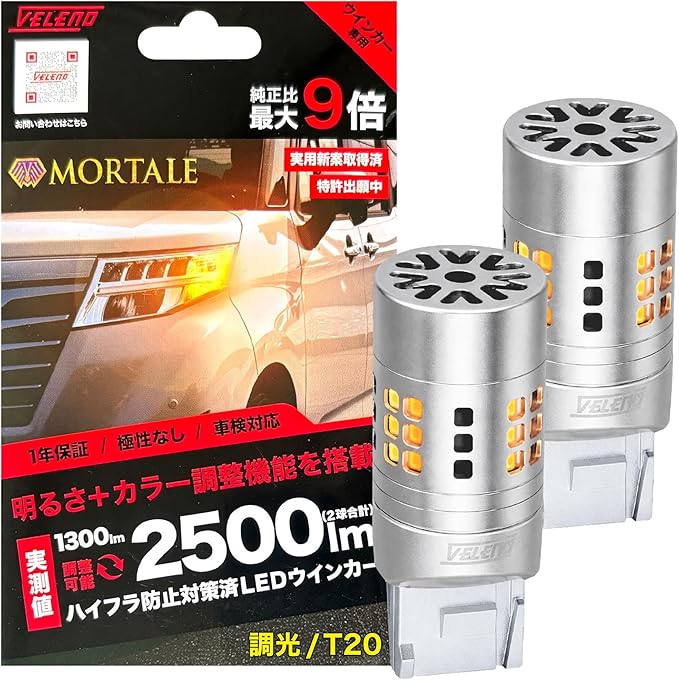 VELENO T20 LED ウインカー 実測値 2500lm 明るさ調整可 調光機能 ハイフラ防止 抵抗内蔵 冷却ファン搭載 ピンチ部違い ステルスバルブ 12V 車検対応 アンバー 調光 w015 (T20 ピンチ部違い)